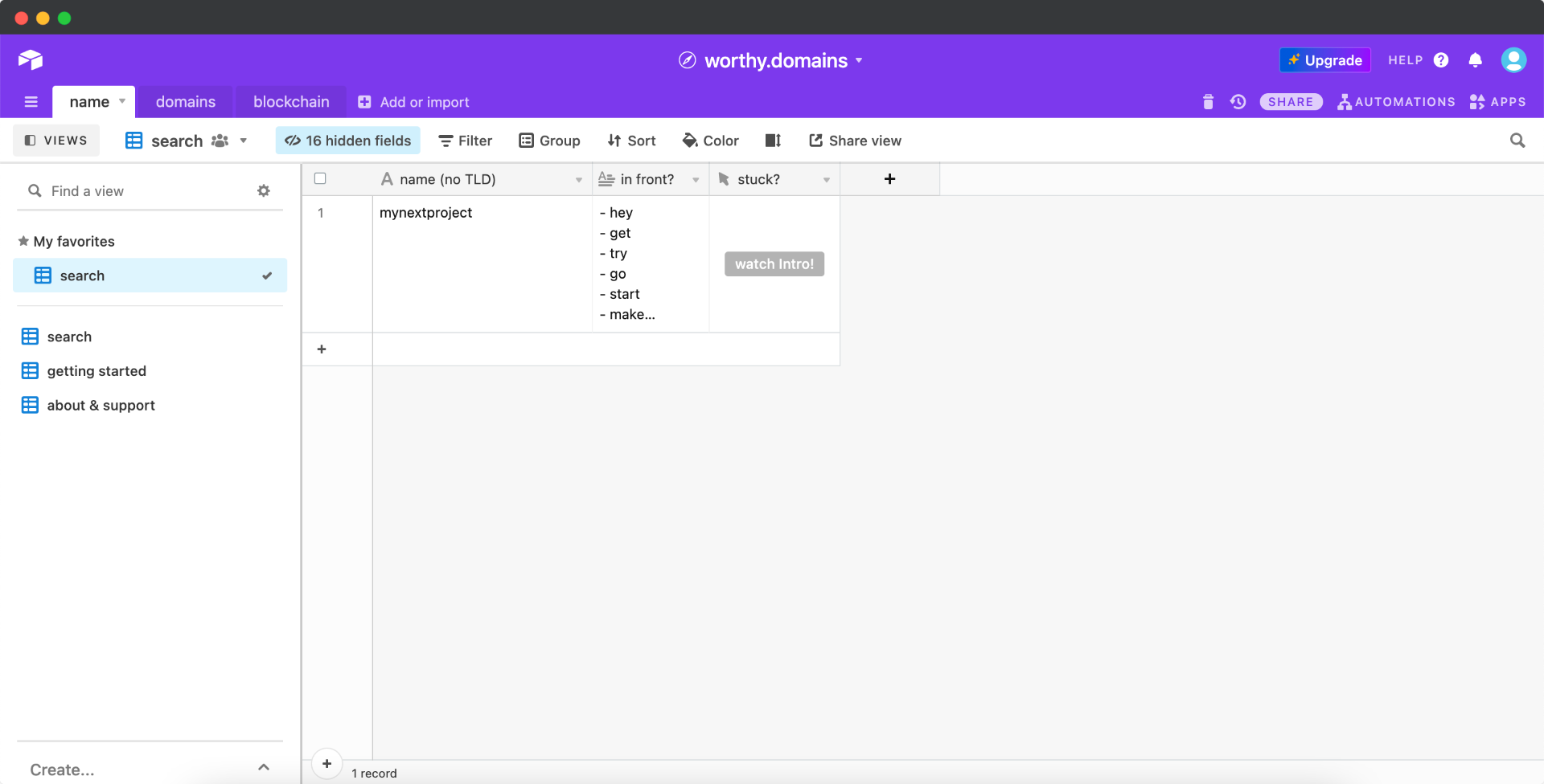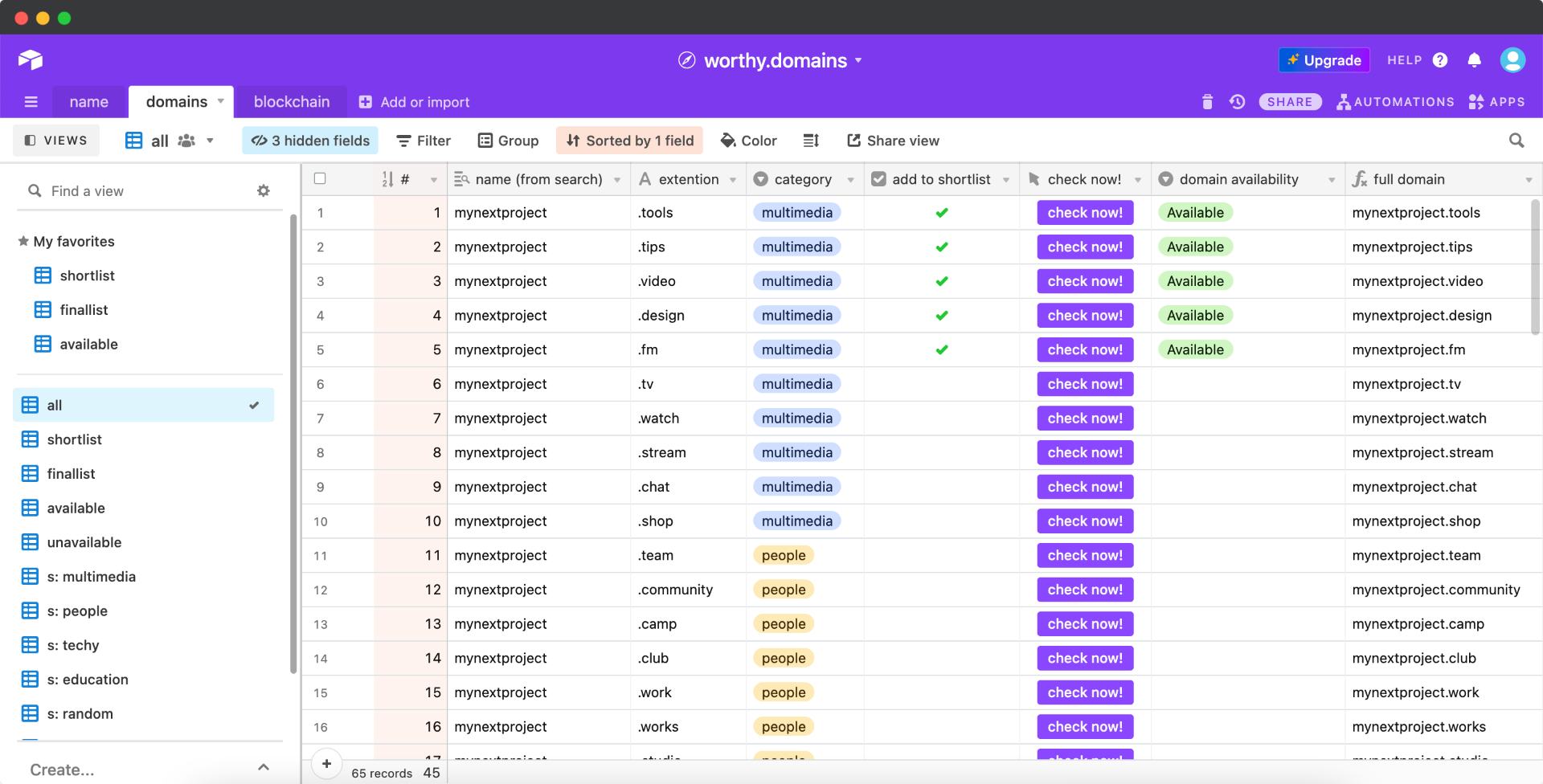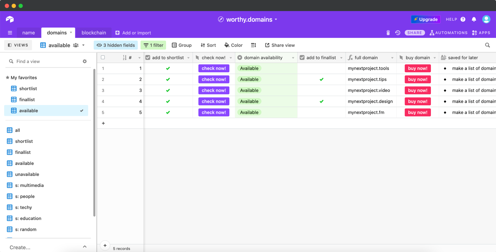 Decide which domain names are your favorite and which ones you want to discard. All by simply changing the Airtable view.